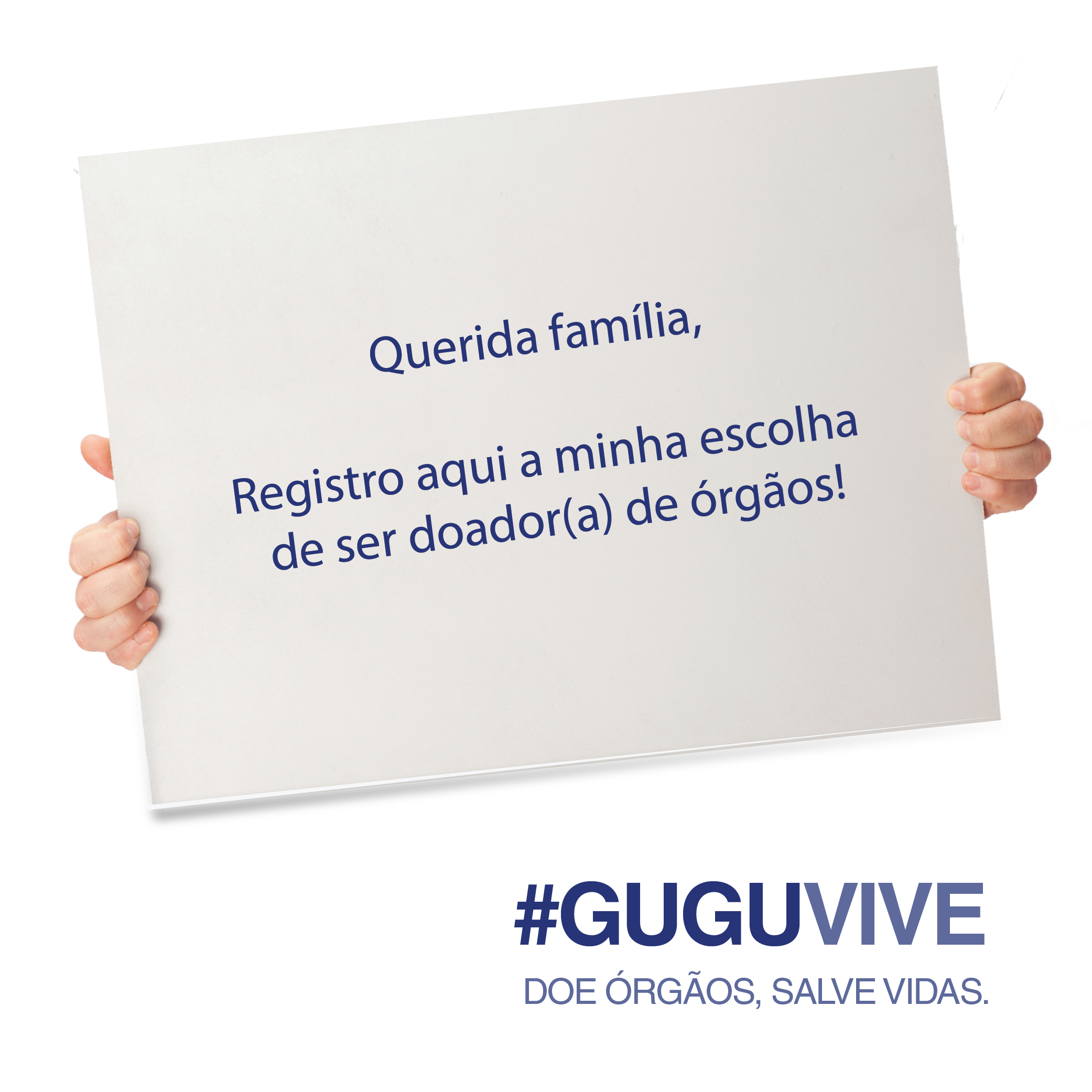 Com essa campanha, queremos criar uma grande corrente do bem e aumentar o número de doadores de órgãos no Brasil. Para participar é muito simples! Navegue pelo site para saber tudo sobre doação de órgãos e tecidos. Depois de ter as suas dúvidas esclarecidas, poste em suas redes sociais um vídeo ou mensagem se declarando doador de órgãos, com a #GuguVive.